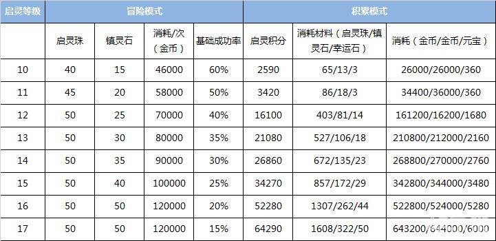 有小伙伴要说了,上面的内容深入玩游戏的都知道的七七八八了,那么,干货要来了。启灵1-9比较简单,就不多说了,直接从启灵10开始,详见表格,需要注意的是积累模式下,启灵珠、镇灵石、幸运石3者可三选一,并不是3个都需要使用,当然,也可以混用。