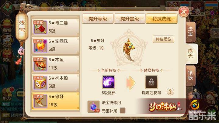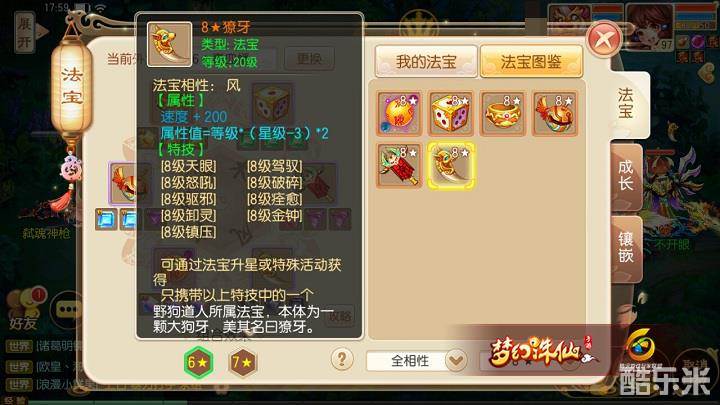 作为稀有法宝的獠牙在培养时还是有些困难的,这里需要玩家使用同级喂养的方式来提升星级,虽然此举会消耗大量的聚星丹,但却可以有效提升法宝素材的利用率,让素材有限的獠牙在星级上不落于其它法宝之后(需注意此举并非具有节省开支的效果,但却可以玩家今早获得高星法宝套装属性加成)。而法宝自身的属性加成不仅与星级有关也与等级有关,自然玩家在升级时不要忘了优先提升獠牙的等级哟!