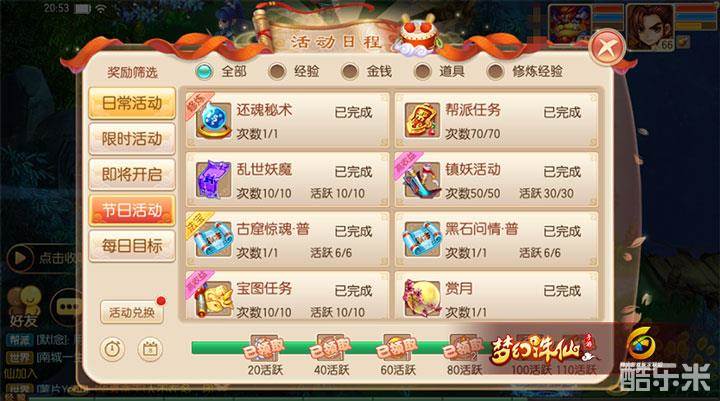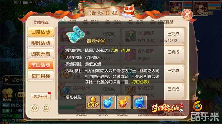 除此之外还有2个只要需要答题,就能简简单单获得大量经验与银币奖励的任务,青云学堂和诛仙奇缘。青云学堂不仅可以获得经验与银币,还可以获得神兽和仙侣需要的兑换道具,而诛仙奇缘则是经验与一些基础道具。如果遇到了不会的题目,还可以求助帮里的同僚,来帮助回答,答对6道题目以上还有额外的奖励哟!