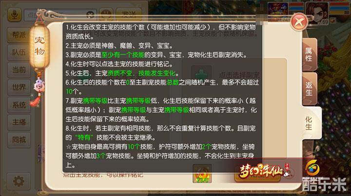 2)化生不会影响主宠资质,只会影响技能数,其中特有技能不可被继承;