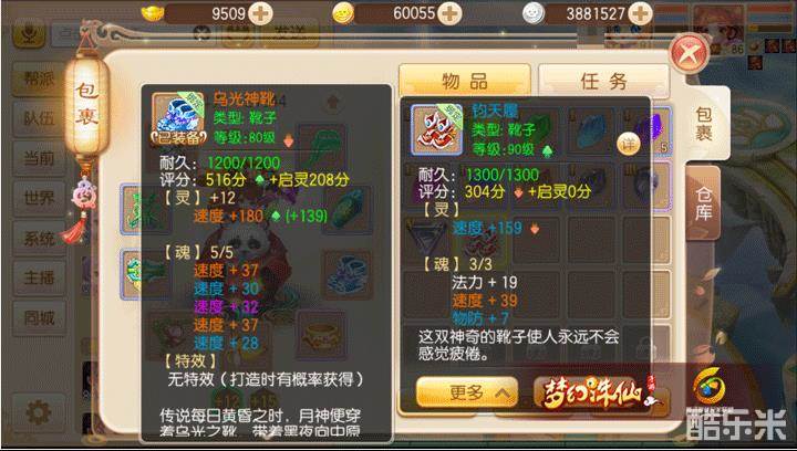 这次给各位展示的80级靴子—乌光神靴可以说堪称极品:首先在启灵等级方面满级增加的231点速度极为惹眼;其次在魂方面5橙的速度魂更是异常扎眼,可以说这一套魂即使附到90级靴子上依旧给力;最后特效方面的“蹈海”虽不能增加速度值,但对于法系输出门派来说实属良技,自然纵使这款神靴自身速度值只是一般对于玩家来说也算得上极品跑鞋了。
