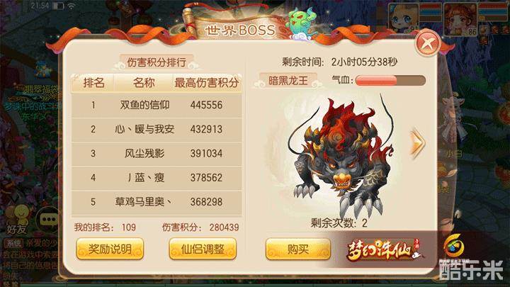 世界Boss活动副本每周一次,每周五晚八点准时开启。在活动中每位玩家有5次免费挑战的机会,而活动结束后会根据玩家的最大伤害积分进行排名统计,自然排名越高最终奖励也就越丰厚!