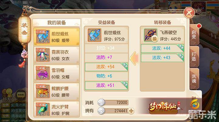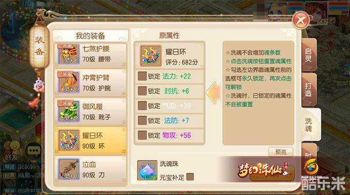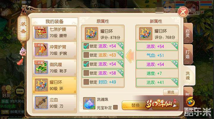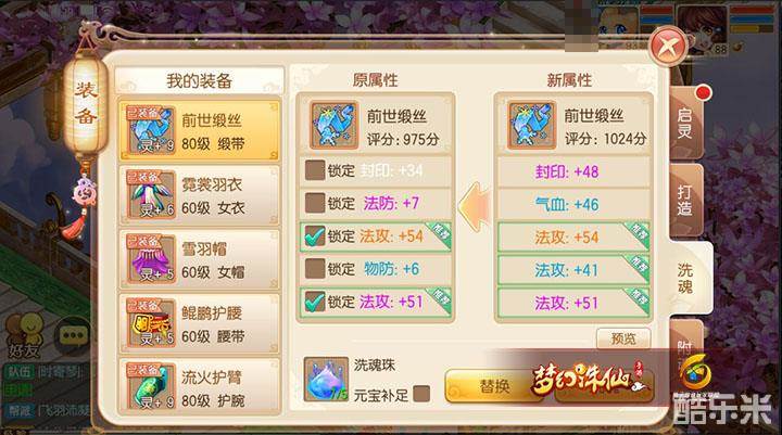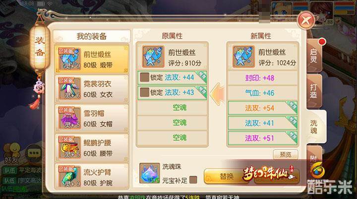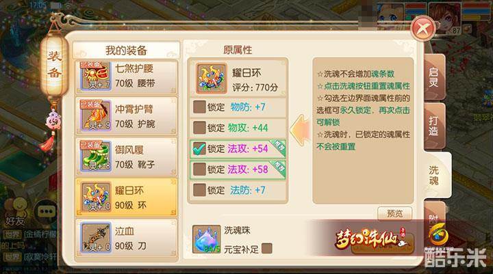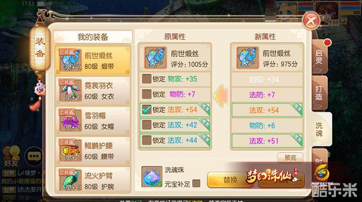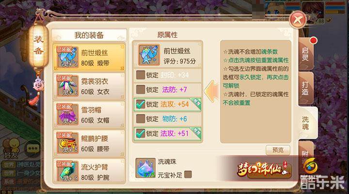 如图,注意两条蓝色的法攻魂是不要的,原始只留下法攻+54的魂,锁定后洗,洗出法攻+51的魂,替换,替换后锁定法攻+51(使用了5个锁魂玉),如下图。