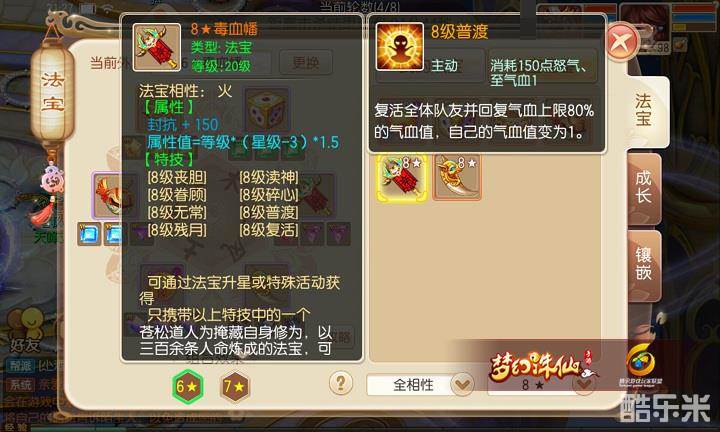 火相位的嗜血幡本身可增加封印抗性,而该属性在PVP竞技对抗中极为适用(降低圣巫封印技能与天音怒魂引的命中概率),所以毒血幡值得重点培养!并且六级解锁的特技普渡更是逆天:当怒气达到150后通过消耗自身剩余血量来复活场上所有已死亡队友并回复大额血量;可以说在竞技对抗中这招往往能扭转乾坤,自然极其适合天音这个辅助型门派携带。