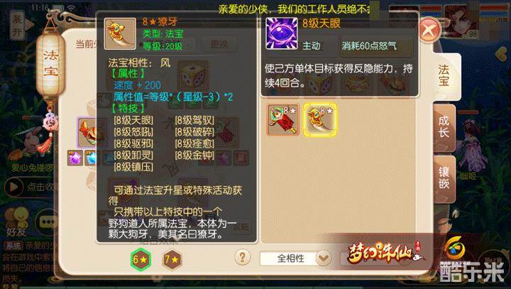 风相位的獠牙对于玩家来说其重要性不弱于嗜血幡,毕竟之前就有说过速度值在竞技对抗中的作用要远胜于其它属性,对于追求速度的天音玩家来说肯定需要优先培养;至于特技方面这里建议选择低级就能解锁的“天眼”,毕竟现阶段隐身宠泛滥,天生没有反隐能力的天音如果不选择该特技则很容易在竞技对抗中被对方的隐攻宠逆袭翻盘。