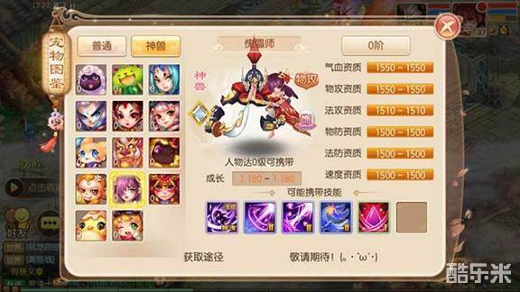 神兽相较于其他宠物而言,资质和成长是神兽的亮点:资质非常高而且每项均为满值,玩家不需要在这方面再下功夫(灵兽果、炼骨符)去培养,而且神兽有着进阶功能可以使自己的资质不断增长,是普通高级宝宝不可以比拟的。