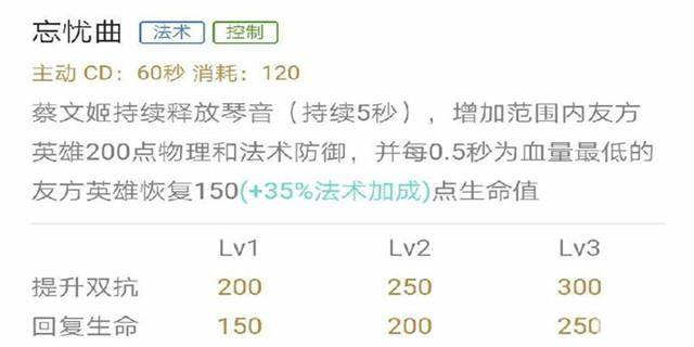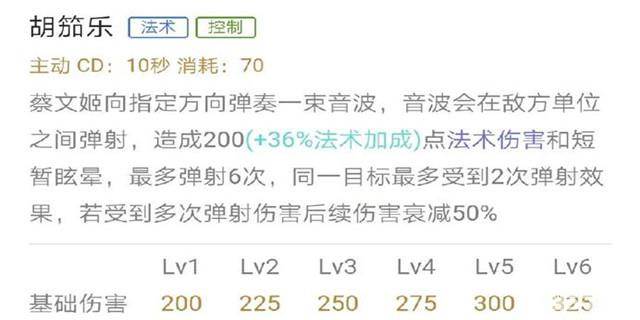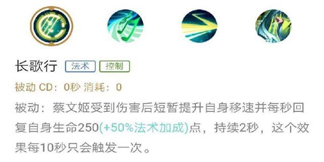 解析:被动可以在蔡文姬受到伤害的时候恢复生命值,恢复量是由法强和英雄等级决定的,所以需要一定的法术装备来保证回复量。被动的回血和加速使蔡文姬可以大胆地去探视野或者骚扰敌军,在撤退时也非常好用。