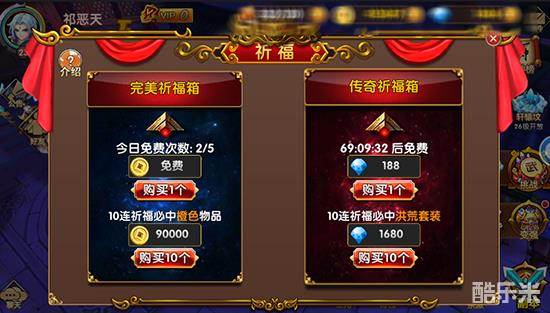 游戏中,祈福玩法分为两种方式,金币祈福的完美祈福箱和钻石祈福的传奇祈福箱。