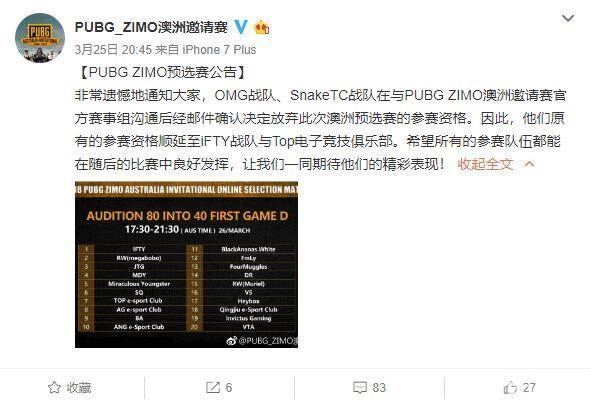 PUBG澳洲邀请赛预选赛已经结束,80进2的赛制让预选赛变的非常残酷,以至于OMG、Snake-TC战队无暇分身放弃了预选赛资格,D组小组赛是在全民直播上完成的,也确定了最后晋级的40支队伍,其中有不少中国战队,他们将在3月31日至4月7日参加40进2的晋级赛,最终胜利的2支队伍将参加澳洲邀请赛决赛。