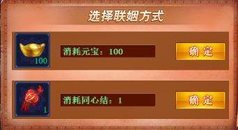 点击招亲后选择联姻的方式,是用同心结还是元宝。其实根本没有差距。反正被拒绝都返还的。