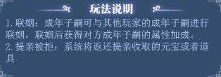 联姻可以获得儿媳妇或女婿的属性加成。被拒绝则返还道具。怎么看都是稳赚不赔,直接获得一个角色的属性加成的良心玩法呀。小伙伴们快去找自己的儿媳妇或者女婿吧。当然如果你还没有孩子可就得去红颜界面好好疼爱疼爱你的红颜知己啦。