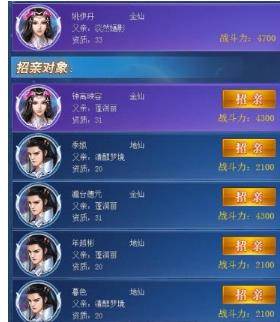 这里是招亲的列表,看看这些个小娃娃。虽然长得都是一个样。但是属性可是有着差距的哟。仔细看资质和战斗力。挑选一个最好的(别人看不上你我也没办法的)