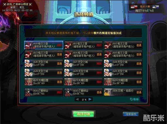 每个服务器有多个频道,频道有聚集相似等级玩家的效果,此效果对活跃组队游戏和物品交易有很大的帮助。进入适合自己角色等级的频道可以增加通关地下城时的经验。