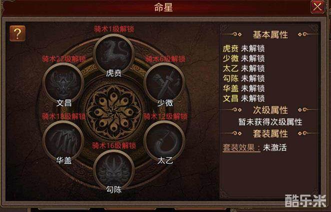 命星一共有6种类型,分别是:虎贲、少微、太乙、勾陈、华盖、文昌;均需要达到一定的骑术等级才能解锁,如图示: