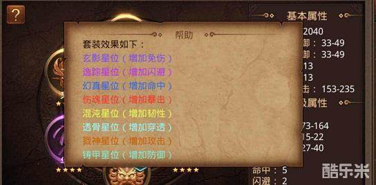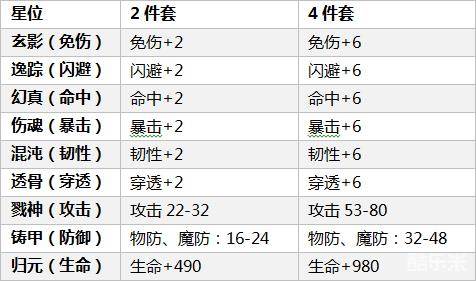 c) 星位属性 就是套装属性,相同星位的2件、4件可以激活星位属性,最多可同时激活3个套装效果;目前一共有9种星位,分别是:玄影、逸踪、幻真、伤魂、混沌、透骨、戮神、铸甲、归元,不同星位的套装效果不同,星位具体效果如下: