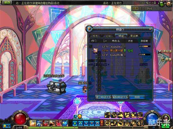 在游戏中角色之间可成为好友,也可增加到师徒关系中。每日好友增加数量是没有限制的,但每日只能增加一名师傅或者徒弟。加入公会的公会人员根据公会等级不同有相应的能力值补偿。此部分与公会等级挂钩,公会人员努力游戏时公会经验值会增加,公会也会升级。社区窗口可以通过点击右上端的菜单或用快捷键‘L’显示。