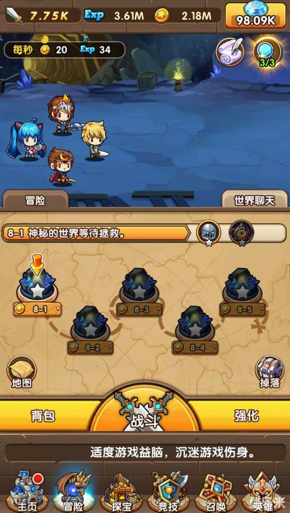 整个冒险地图有100个关卡,前面1-6关只有简单难度,7-12关就有简单和普通两个难度,13-100关都是三个难度,简单、普通、困难。每一关又有5小关,每一小关过关之后才能到下一关(特别注意,每次打关卡的时候会消耗金币,如果没有打过下次会金币翻倍,萌新们不要一直打把金币打光了,不过可以重置时间结束后继续打),下面的掉落里面说明了每一小关会掉落的物品以及人物,旁边则显示了在该关卡中每秒获得的金币和经验。下方则是人物界面,并没有什么用,只能看。