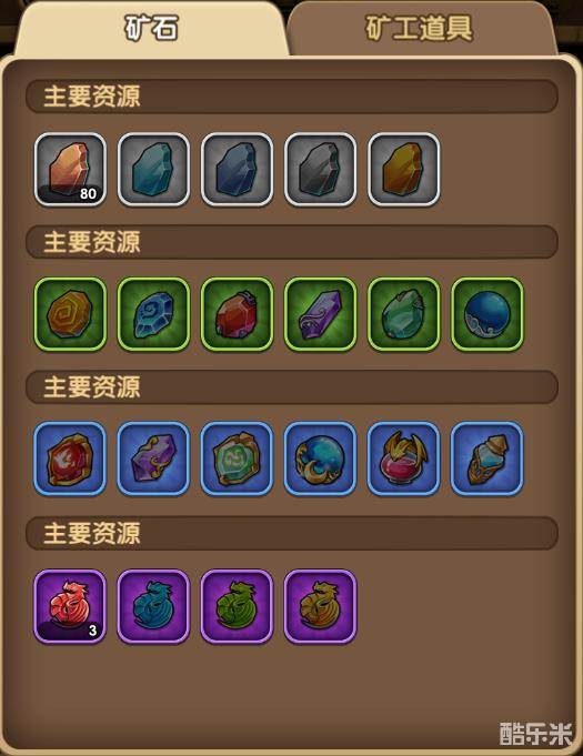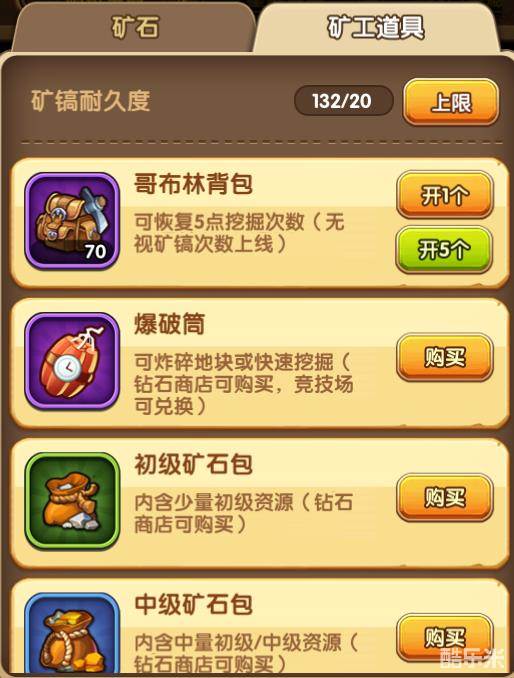 矿工道具里面矿工包一个等于5个矿铲,可以用钻石购买。下面是初级、中级、高级矿包可以开出各种资源,需要钻石购买。
