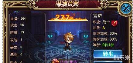 雪诺,A阶战士。血量264,攻击66,防御33。防御偏高,其余都是正常的数值。