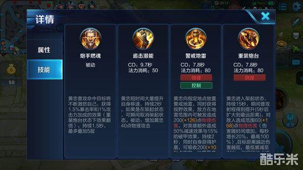 黄忠瞬间获得大幅度移速加成,这个加成非常可观,操作好的黄忠可以依靠一技能的快速走位躲过大量技能。此外,一技能能够使得炮台架起状态下的黄忠瞬间取消架起状态,在防止被刺客切入时非常有效。由于一技能能增加物理攻击力,因此加点方面主升一技能。