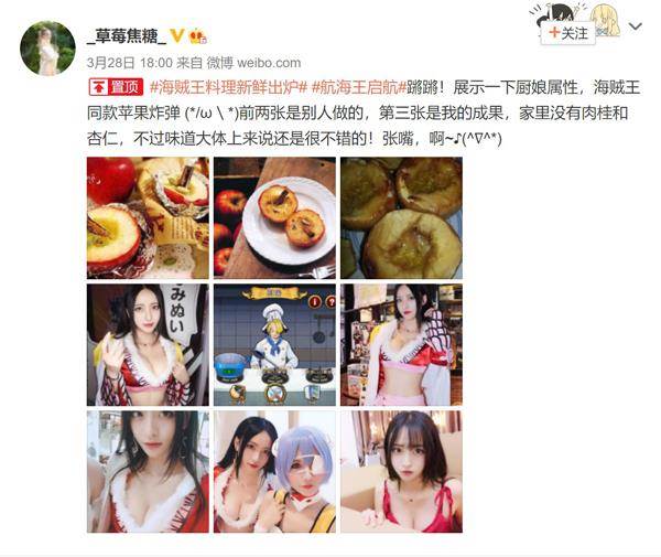 3月28日,作为《航海王启航》手游玩家的动漫博主_草莓焦糖_在自己的新浪微博主页上上传了自己料理的苹果炸弹,并且放出《航海王启航》的游戏截图,号召大家一起来还原伟大航路中曾经出现过的美食。原来这位相貌出众的小姐姐不仅仅是《航海王启航》的忠实玩家,还是是一位航海王coser,她还在微博中发出自己cosplay女帝波雅汉库克的照片。