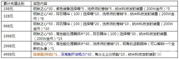 活动内容:活动期间,玩家在游戏内累计充值达到活动条件,即可领取对应数量的钢骨进化道具-钢铁之心。