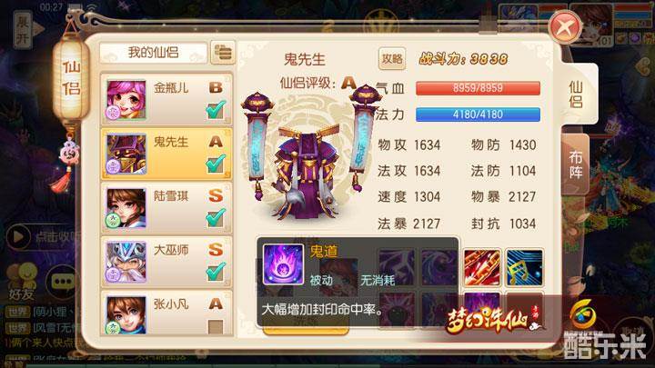 再说一说封系的鬼先生,整套阵容里面没有选择玲珑,主要原因还是玲珑虽然有一定几率可以双封,但是封系法术的命中率却不及鬼先生来的稳准狠,要想安逸通关稳是一切先决条件,所以鬼先生必上无疑。
