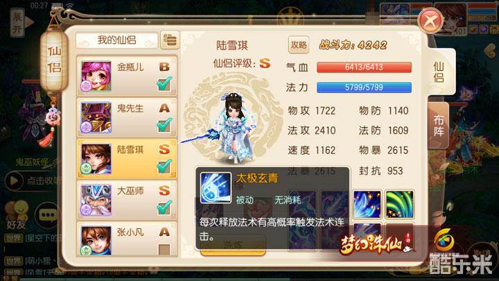 陆雪琪可谓是所有仙侣中性价比最高的了,连续签到3天就可以获得也算是种福利,并且其技能的可靠性与实用性也是不愧对S的评级:高概率的法术连击,法术穿透10%以及攻击血量最少的目标无一不是作为法术型仙侣的最佳选择,所以为了整体的输出能力,必上!