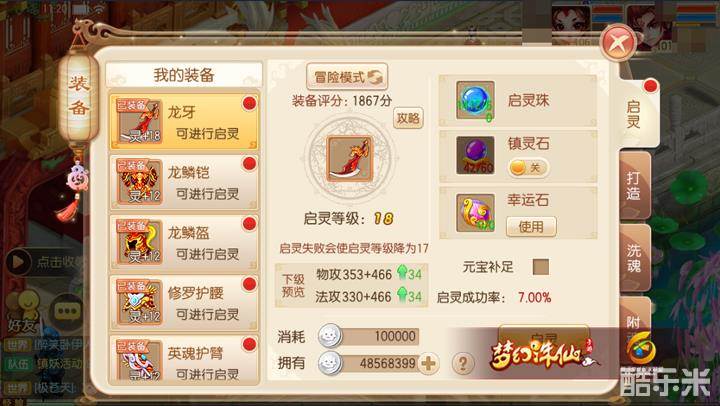 首先我们来说说启灵,该强化途径是玩家在低级时就会接触的玩法,并且对于玩家而言初期有钱就投入启灵是稳赚不赔的买卖。但是随着启灵等级的提升收益将会变得越来越低,如果盲目将财力投入到启灵中是很不明智的,这里建议玩家先将装备启灵成12套,然后将武器与鞋子启灵到15就可以缓缓了(空出金钱干别的事)。