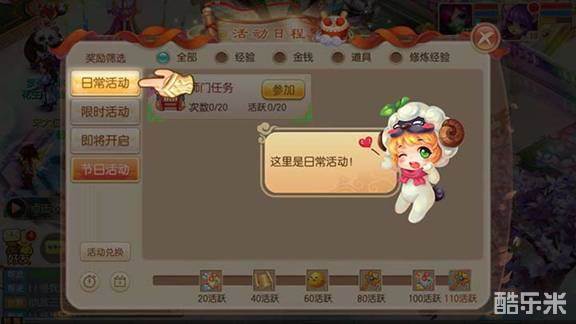 日常活动除了活得大量的经验和金币、银币奖励还可以获得各种游戏道具,最重要的是还可以获得日常活跃度和活力值,活跃度可以领取活跃奖励,而活力则是生活技能所需要的道具,所有兜妹建议少侠日常活动一定要做完哦!