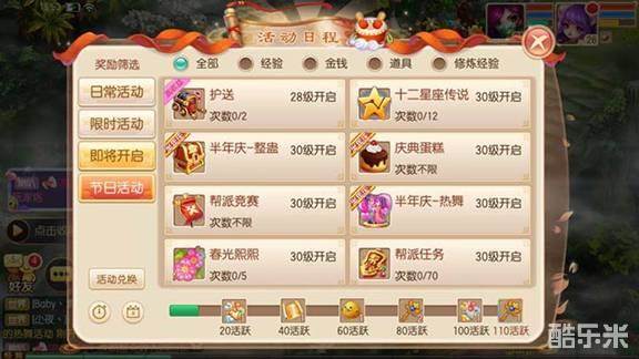 在“活动”系统界面可以查看当前等级可以完成的日常活动、限时活动、每日目标和节日活动,也可以查看即将开启的活动详情。点击“参加”按钮就可以参加日常活动啦。
