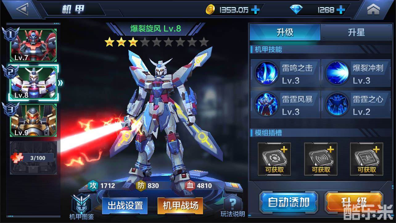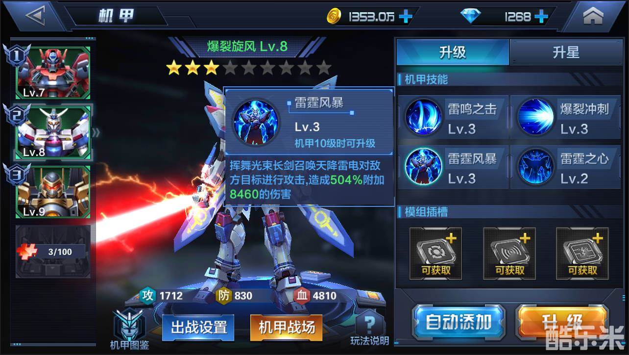 不管是从技能还是从攻击来说,爆裂旋风的属性都相当不错。相对来说比铁甲勇士要好很多,也比星际骑士更早激活,不管是在刷图的过程中还是在PVP中都是一把好手,建议大家要好好培养,即便到最后一个玩家也可以携带三个机甲。不会浪费资源的哦。