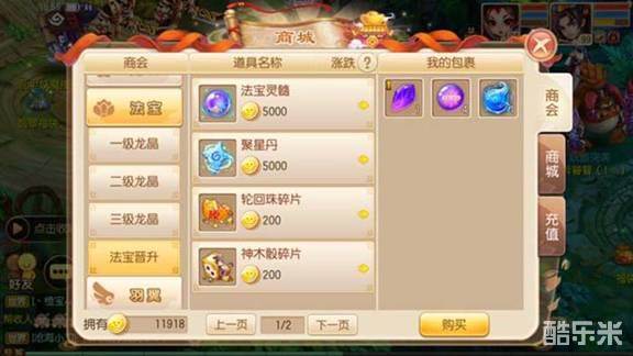 常规法宝可以在商店购买,一个碎片200金币,10个碎片合成一个一星法宝。稀有法宝不能通过商店进行购买,只能通过活动、副本、每周礼包以及竞技场获得。