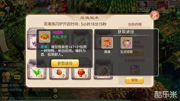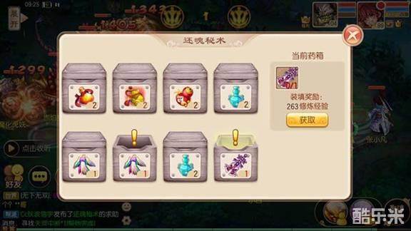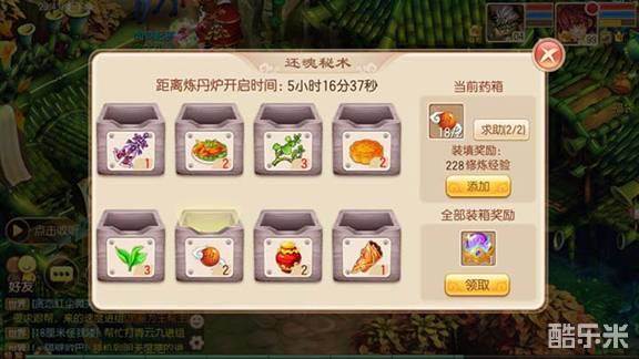 每次添加完成一件箱子所需的任务物品后,都会给予当前默认修炼技能的修炼经验奖励。