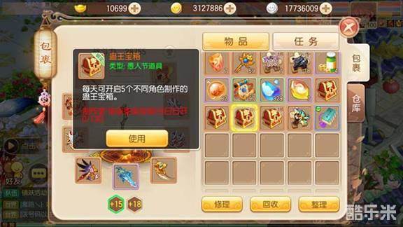 点击画面右下方的包裹,可以打开包裹。点击想要使用的物品,会弹出提示框,点击使用按钮,或者双击想要使用的物品也可使用。