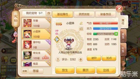 属性界面,可以进行宠物加点、进阶、放生、展示、出战、炼骨、学习技能、装备饰品、查看图鉴等操作。