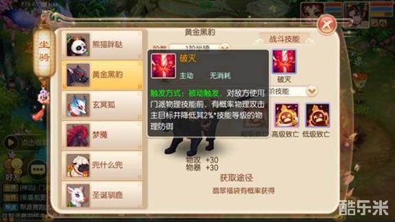鬼王宗坐骑首推黄金黑豹,其附加的属性适合所有物理角色使用,且附加的破灭技能,在对目标进行一次攻击的同时还有概率降低目标0.2×自身等级的物理防御值。另外梦魇也是必备的,毕竟鬼王有了高速度才能发挥出其高攻击的优势。