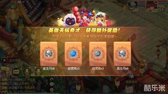 答对6题可以触发翻盘抽奖环节,概率获得启灵珠、返生丹、鬼谷残卷、2000金币、神兽碎片、魔兽碎片、魂之蕴、大修炼丹、经验灵等道具。
