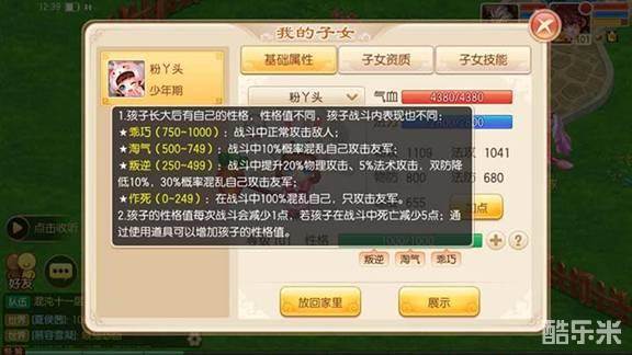 度过7天的“童年期”后,我们的子女就正式“长大成人”了!成人后的子女将可以在战斗中作为“宠物”出战!等同于少侠的修为,异常强大的特色门派技能等等都是子女独一无二的特点!