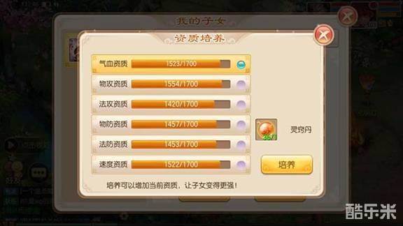 童年期兴趣培养影响少年期的资质,资质可以培养,通过灵窍丹来培养增加(操作类似宠物资质培养,每次使用增加2点资质)