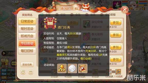 1、师门任务每一环都会获得经验、银币、活力奖励,每轮师门任务根据等级和任务次数的不同,奖励逐渐提高。