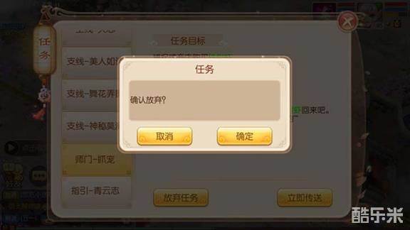 师门任务可以放弃,放弃占用任务环数,不会重置环数,放弃之后可再次接取,接取后自动进入被放弃的任务环数的下一环。