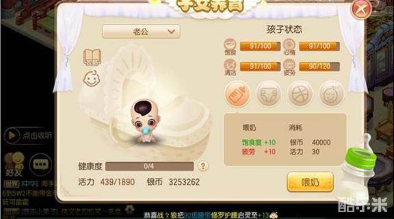 喂奶需要消耗银币4W和30点活力,可以增加宝宝10点饱食度和10点疲劳值。