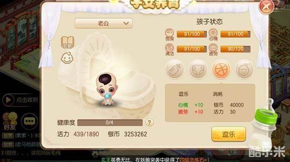 逗乐需要消耗银币4W和30点活力,可以增加宝宝10点心情和10点疲劳值。