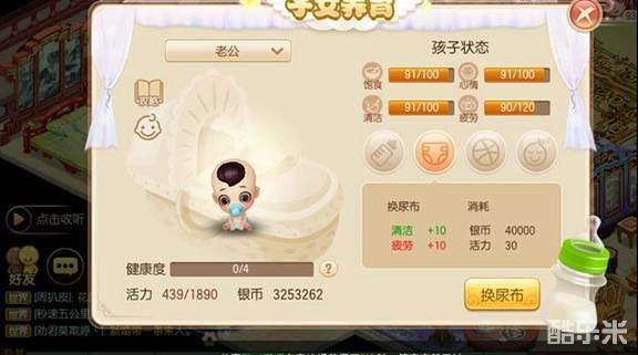 换尿布需要消耗银币4W和30点活力,可以增加宝宝10点清洁度和10点疲劳值。