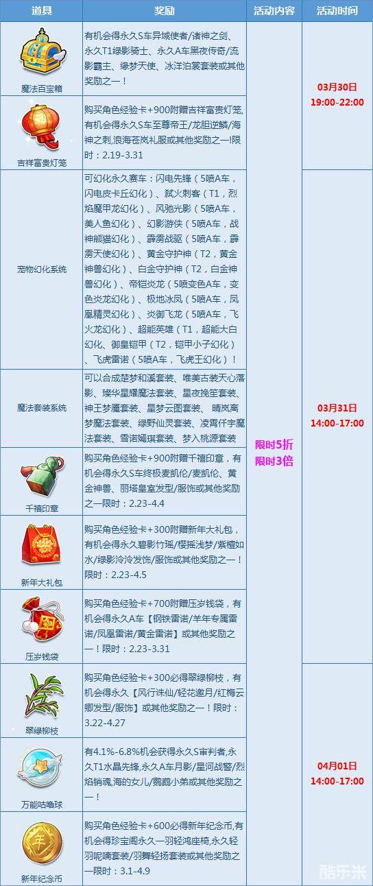 3月30日-4月1日每天固定时间段,【魔法百宝箱】等各式宝箱及宠物幻化系统、魔法套装系统限时5折+3倍概率,有机会得永久S车【终极麦凯伦】/【麦凯伦】/【至尊帝王】/【龙胆逆鳞】/【海神之刺】以及其他各式极品,赶紧来参与。