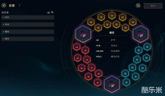 在符文的选择上我选择了三个攻速精华和一个红色攻速8个红色攻击力的搭配,对于亚索来说前期的攻速加成为Q技能带来的CD缩减是要比直接叠攻击力更强的,但是也不能一点攻击力不带不然收兵就非常难受了。