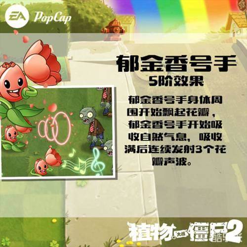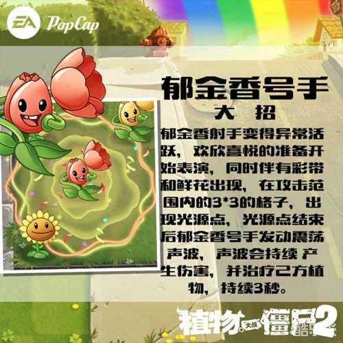 郁金香射手变得异常活跃,一道舞台灯光照下来,郁金香号手准备开始表演,彩带和鲜花出现,在攻击范围内的3*3的格子,出现光源点,光源点结束后产生震荡声波,每个格子内的声波会伴有音乐符号冒出, 声波会持续震动产生伤害,并治疗己方植物,持续5秒。