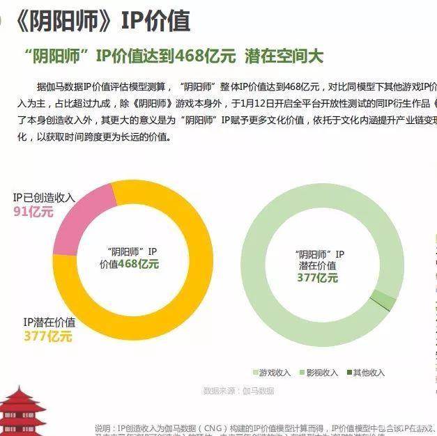 据伽马数据的最新统计分析,《阴阳师》手游目前的IP价值达468亿元,其中除了已创造的90亿元外,还有377亿元的潜在价值可被挖掘。而从游戏衍生出来的泛娱乐内容,将赋予游戏本身文化内涵,并依托这一点来提升整个产业链的变现能力。