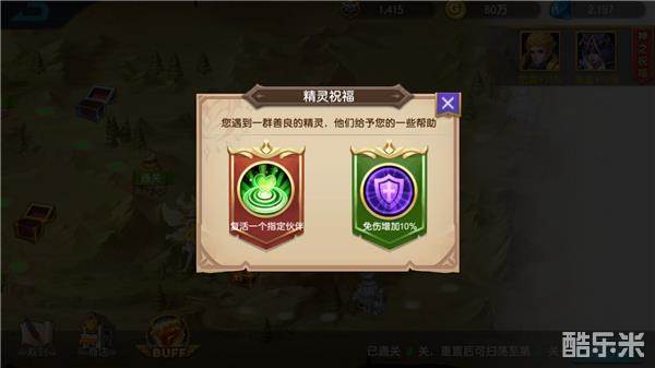 5.开启宝箱时,有几率触发精灵祝福,每次精灵祝福必须选择一项才能前往下一关,相同的增益效果可叠加。